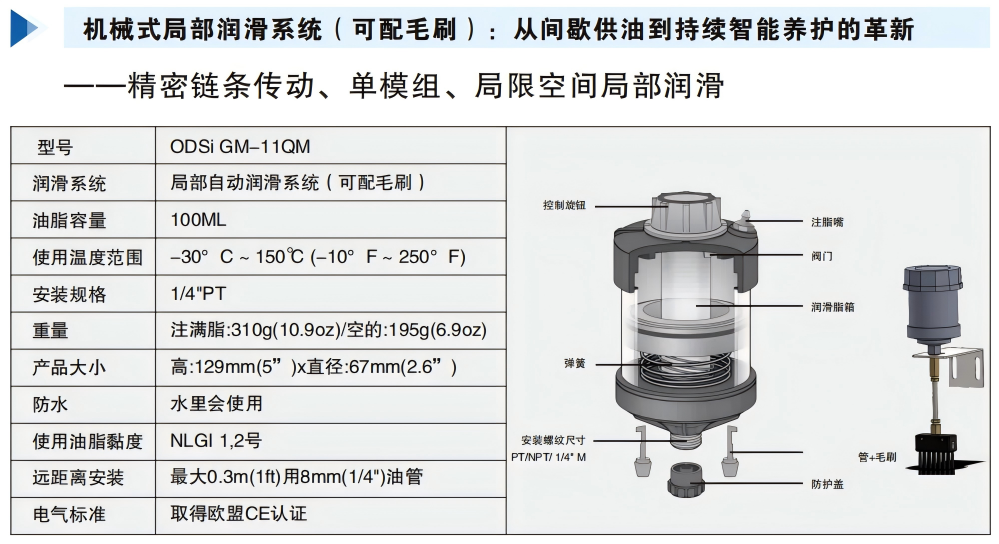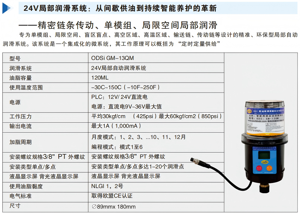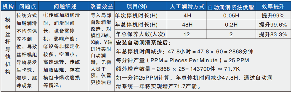 应用局部自动润滑系统带来的核心优势:寿命延长一一精准适量的润滑可使模组丝杆、轴承、链条等部件寿命延长数1-3倍。提升设备0EE一-预计减少因润滑问题导致的非计划停机80%以上,直接增加有效生产时间。安全性增强一一避免维护人员进入危险区域(高温、移动、高空)进行手动操作。减少润滑油脂消耗一一定时定量润滑可比人工润滑节约15%-30%的润滑油脂。管理智能化一一系统可与主机PLC连接,实现运行监控、故障报警和数据记录,为预测性维护提供依据。结论:当您的设备面临高温、高速、重载、多粉尘、难以接近或润滑点密集等一个或多个挑战时,部署一套局部自动润滑系统是极具性价比和技术先进性的解决方案。它成功地将润滑工作从一项“依赖经验的操作”转变为一门“可量化、可管理的工程技术”,是现代工厂实现精益生产和智能运维的关键一步。